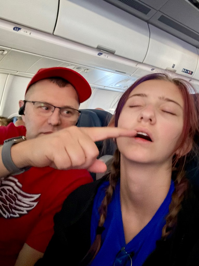 We got up at 3 am Phoenix time to finish up packing and head to the airport. After a 5 hour flight to JFK, we waited out the 5 hour layover and a delayed flight before finally boarding to Lisbon. Keely was unimpressed with the food and preferred sleep (she better start getting adventurous with her food!) Wade and I had a little fun with her.